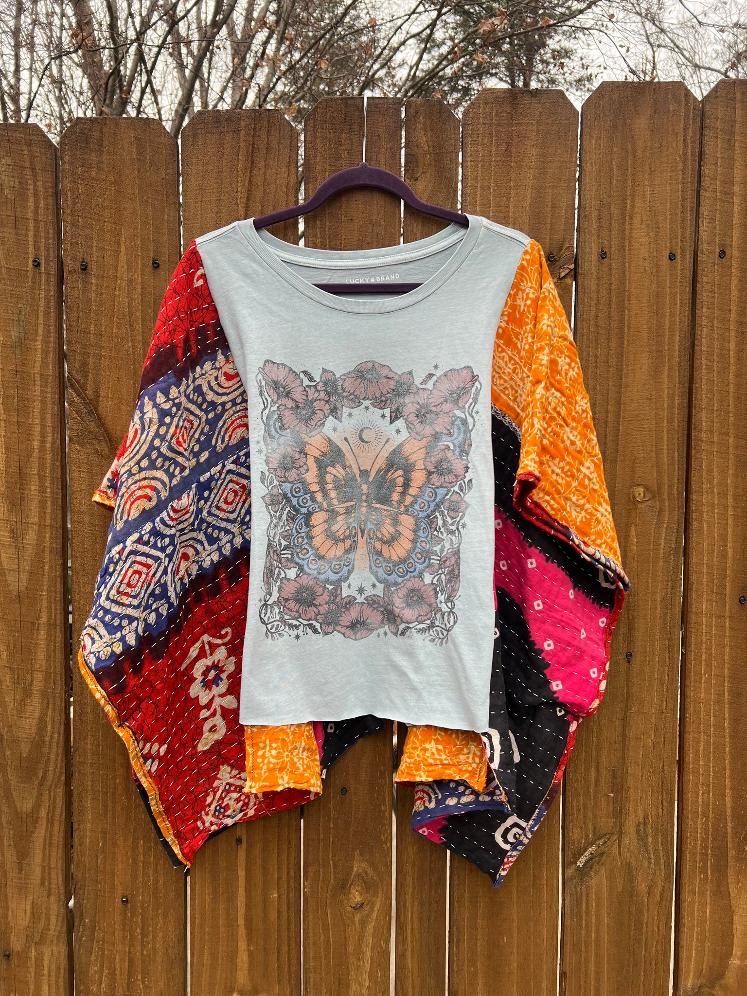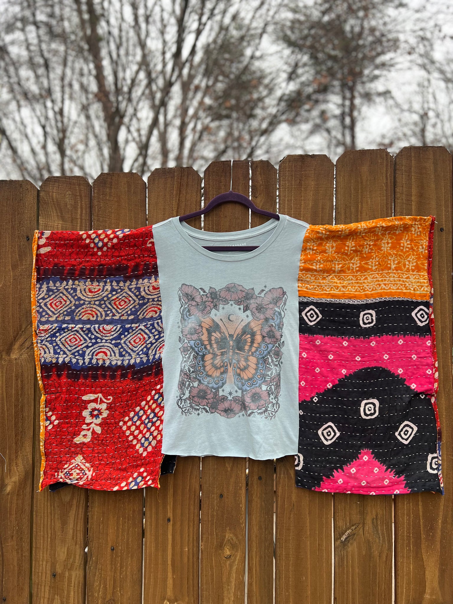 KANTHA TEE KAFTAN // open size handmade // butterfly blue