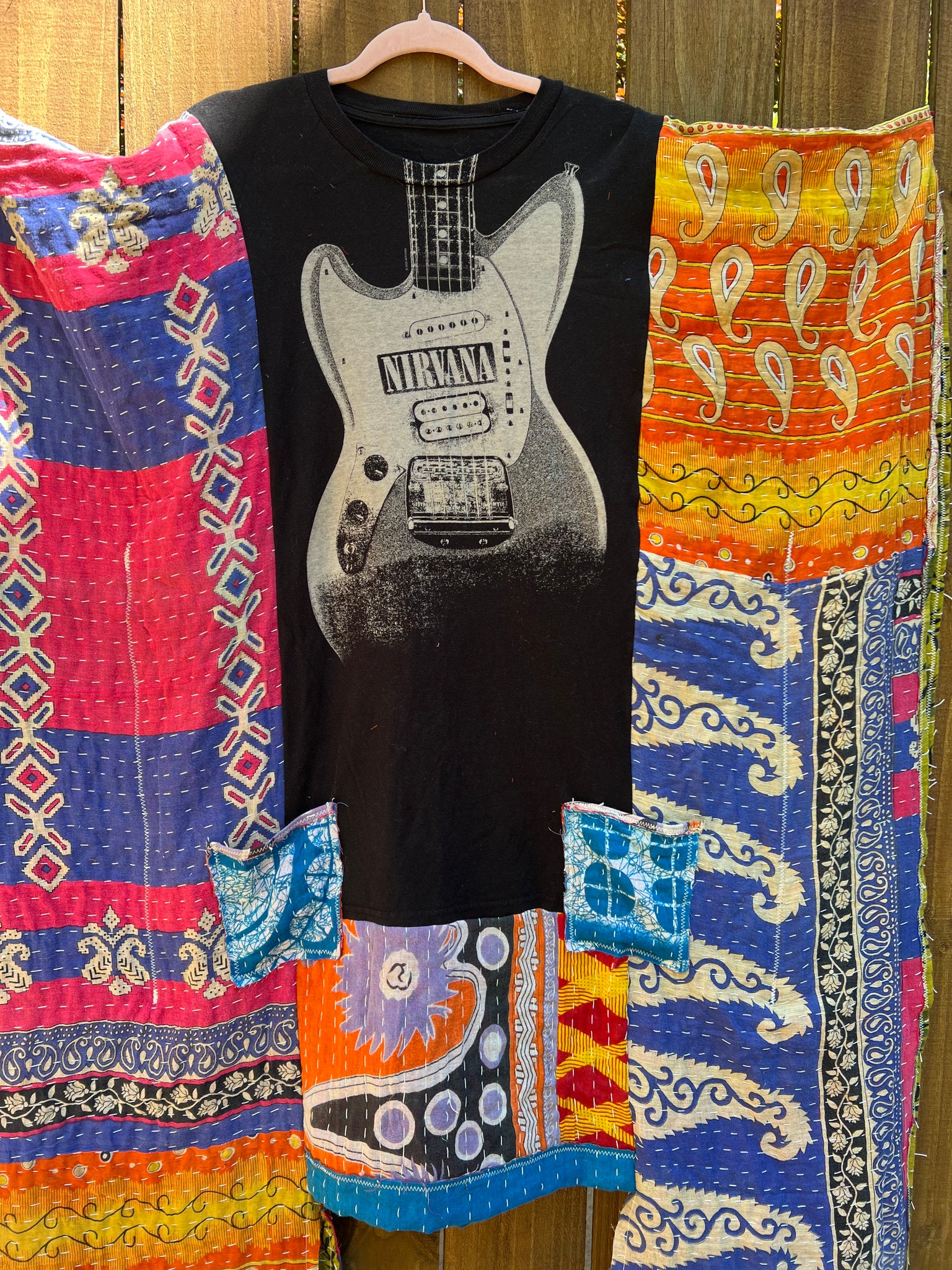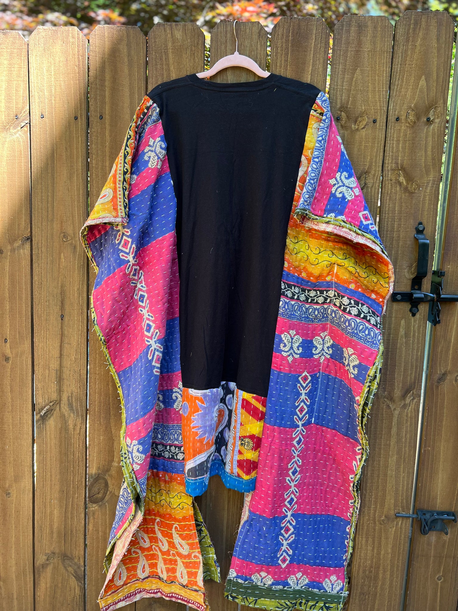thrifted soft brushed cotton tee —Kantha one of a kind dress made from oversized tee and various quilts, closed sides with big sleeves for an open fit.. small-3XL