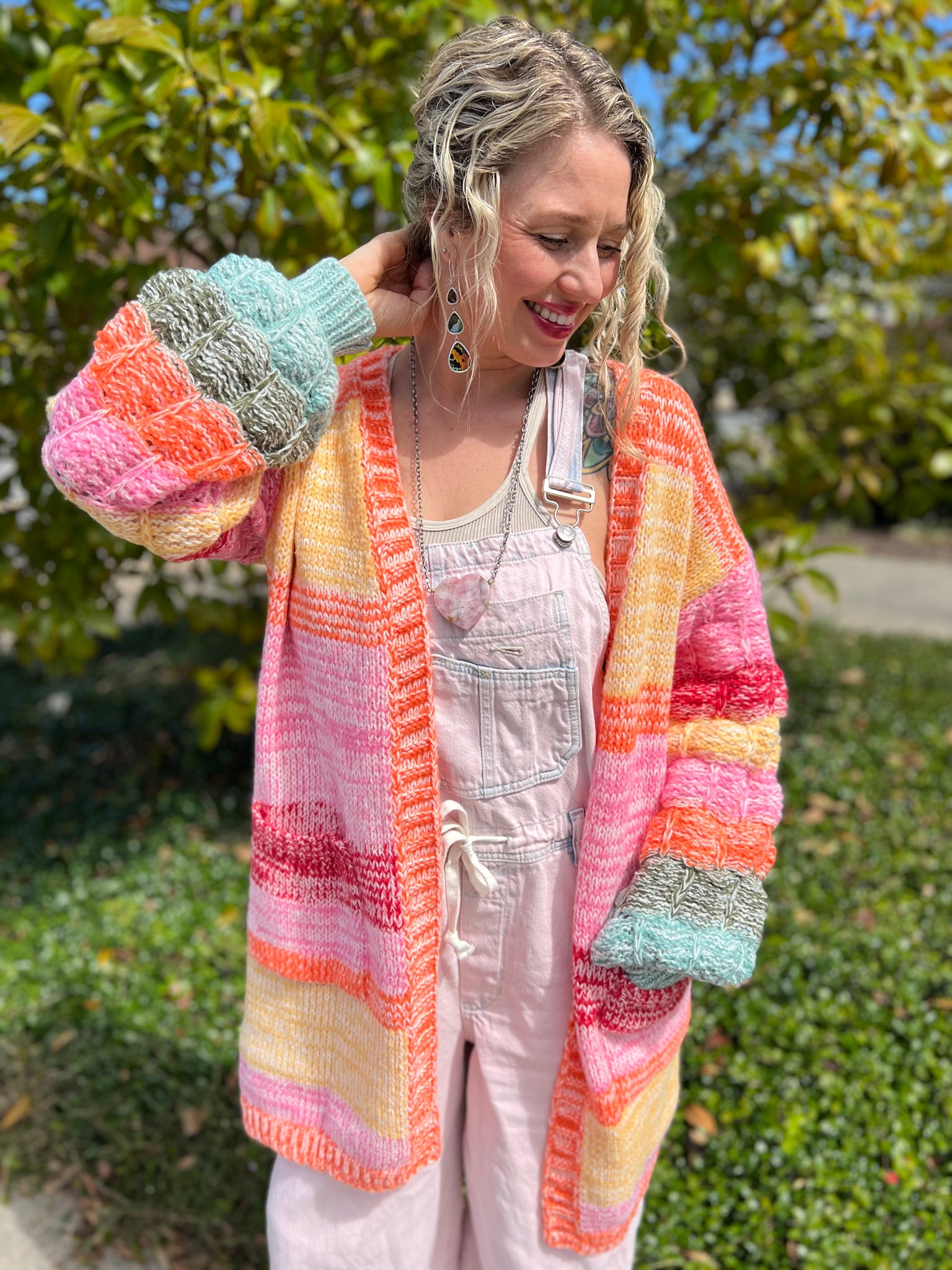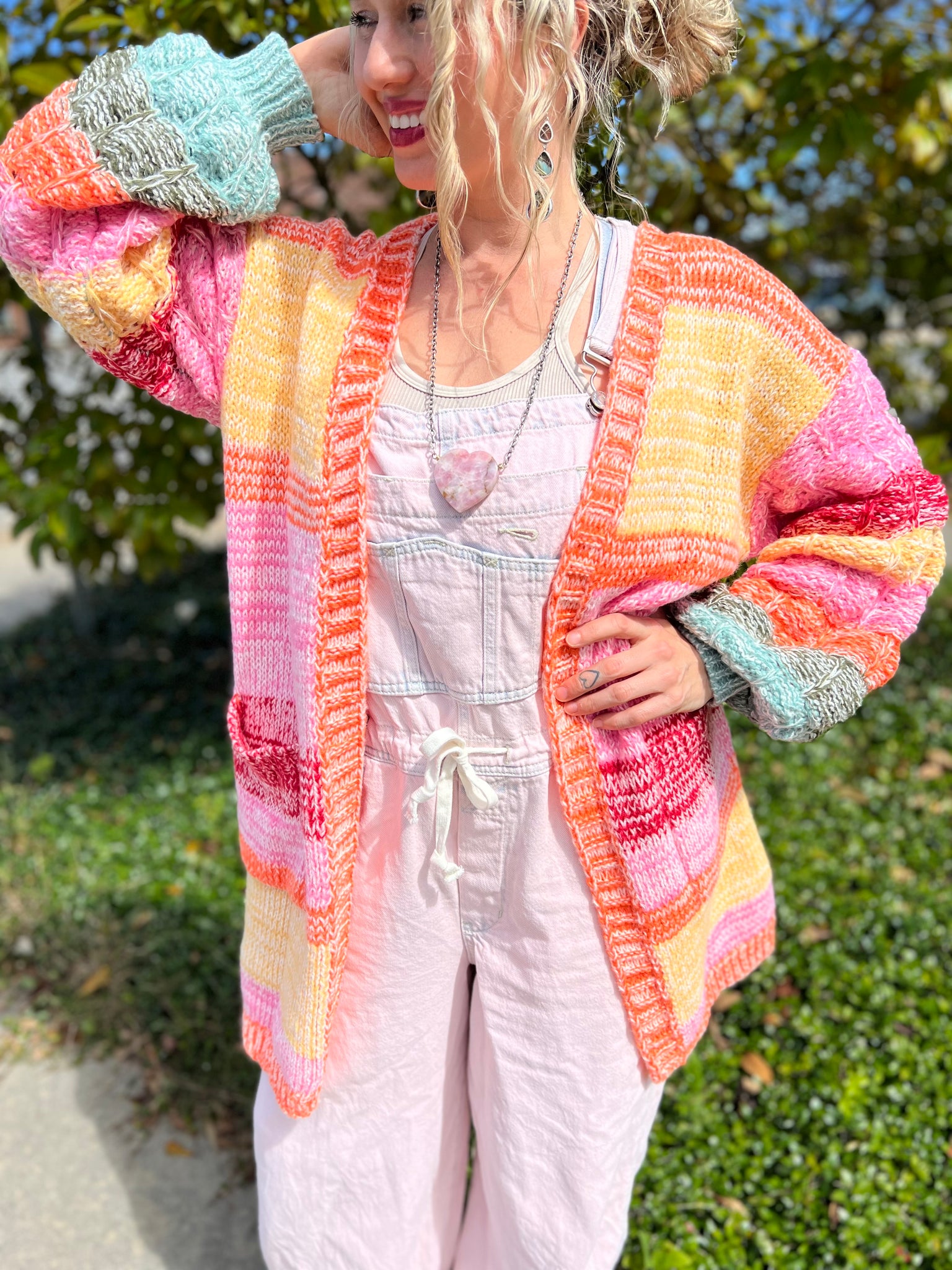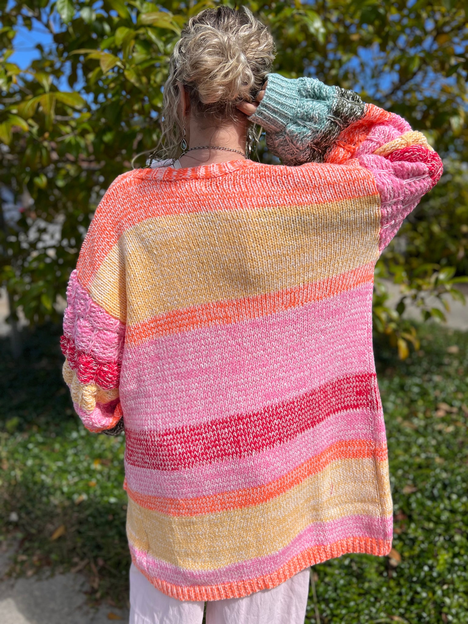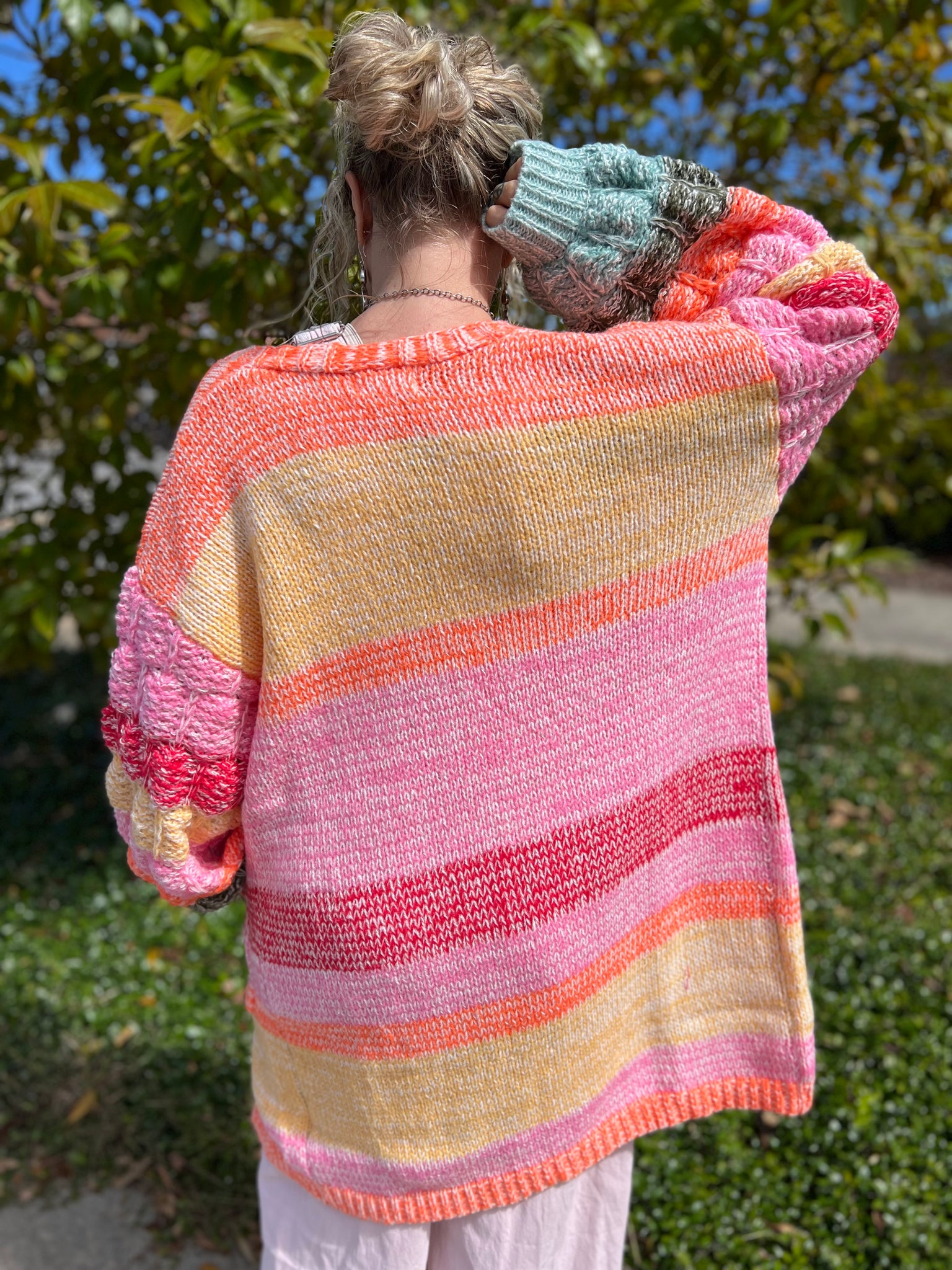 Imported cotton / poly blend open fit chunky knit sweater with fun colors and front pocket. .